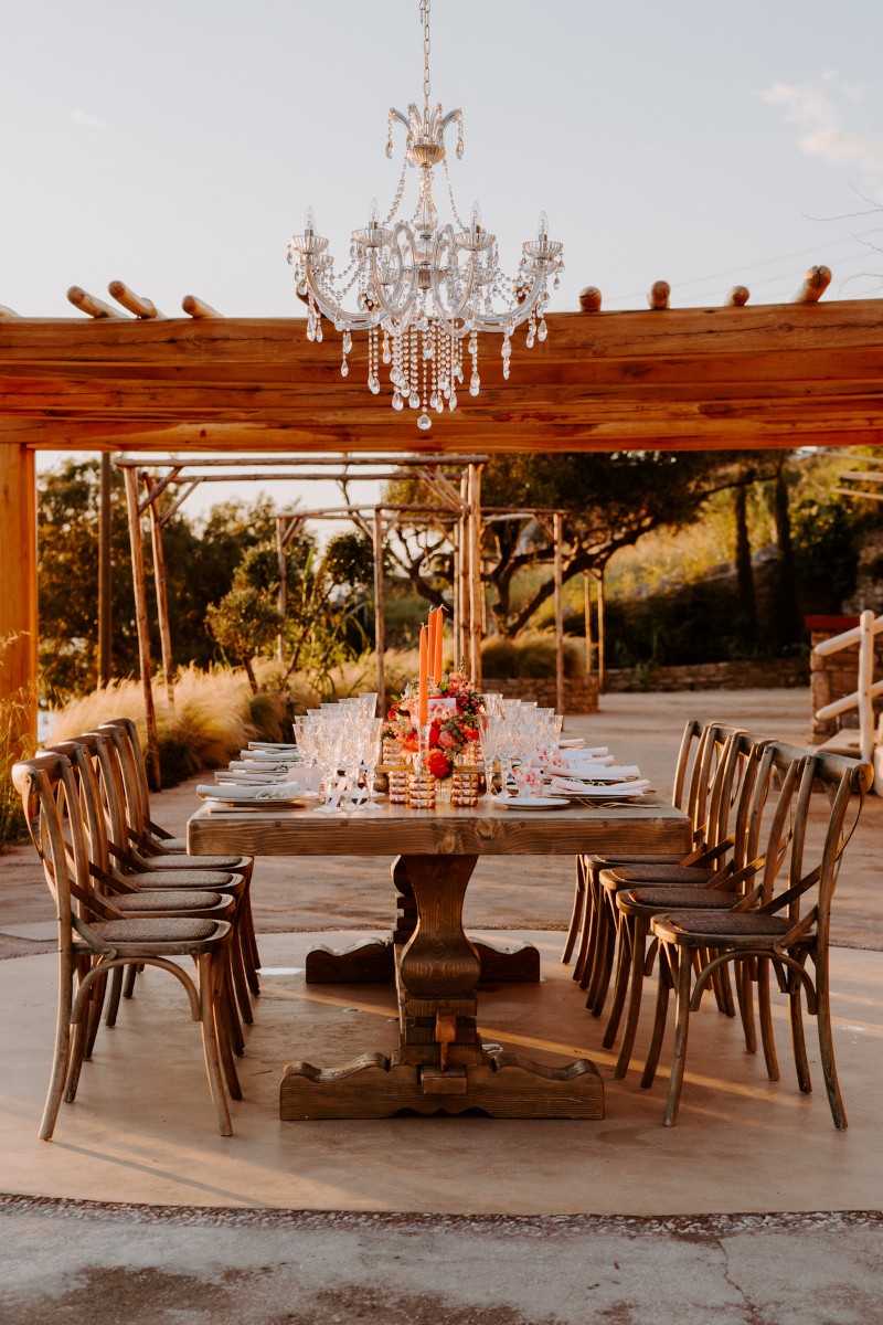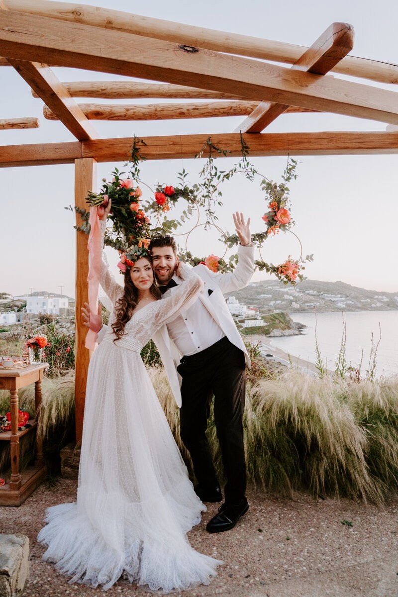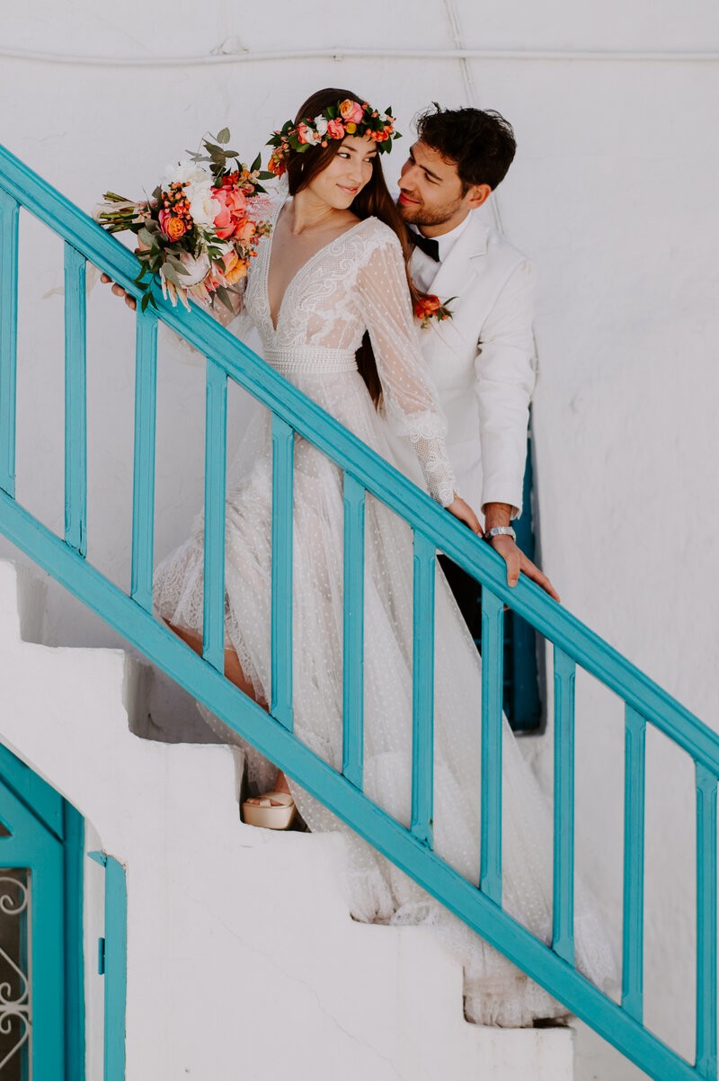 In our quest for inspiration, we sought out unique photo shooting locations that encapsulate the very soul of the island, choosing spots that remain unseen and untapped for wedding settings. Our initial spark of inspiration came from the fusion of tradition embodied by the iconic Myconian windmill, harmonizing seamlessly with breathtaking sunset vistas, thus our coral/warm tones wedding theme was conceived.