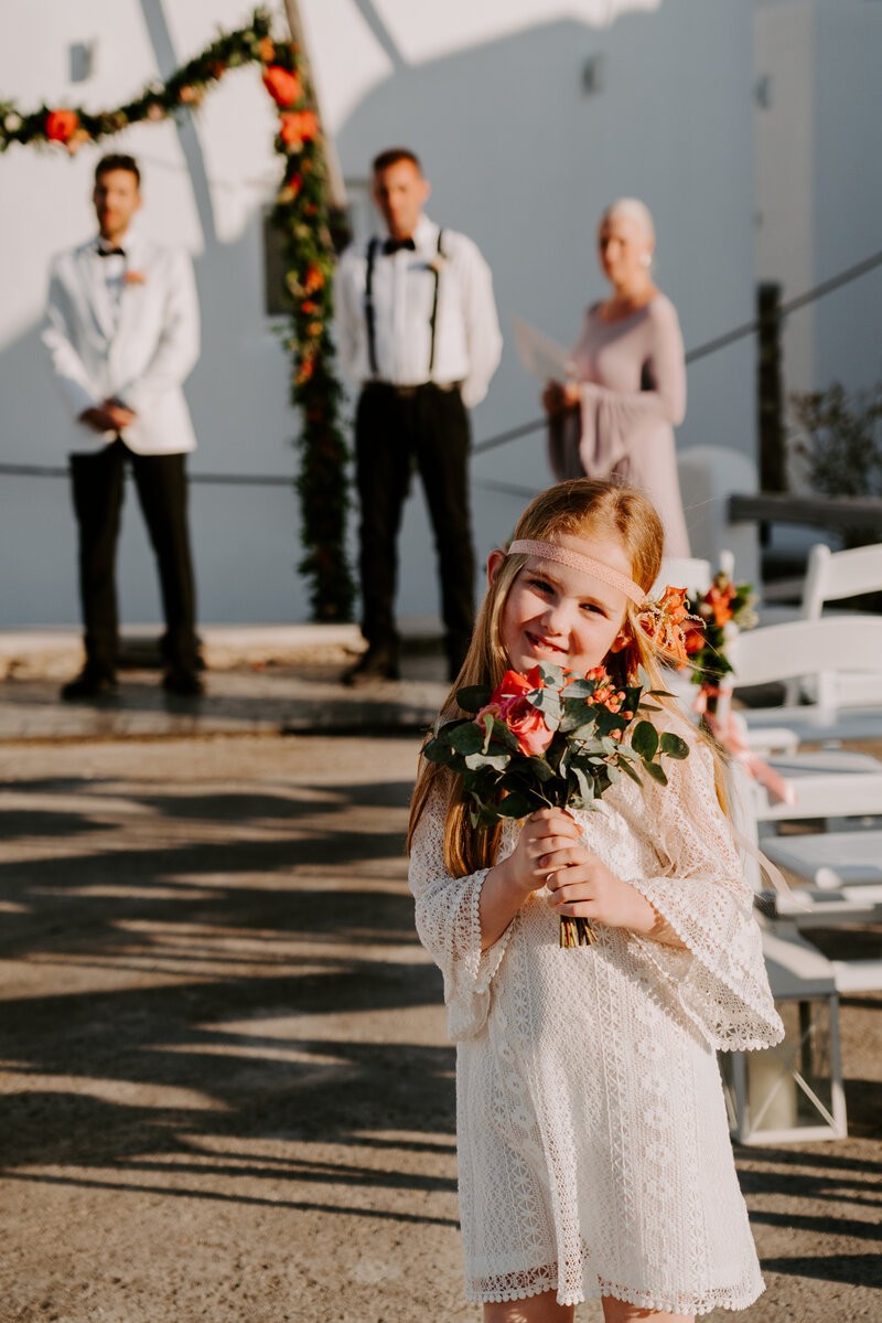 And of course, this Myconian love story would never look so captivating without our two protagonists from Matharikou Models Kids, perfectly curated by our talented MUAH from Hair Fashion and ideally styled with a fantastic Konidi wedding dress, bridal shoes from Shoesante, Jewelry from Lipstickupdates and tuxedo from Papadogambros. Special thanks to our little cute flower girls dressed in Bambolino Clothing and Marikas Mykonos for providing the beautiful bridesmaids dresses.