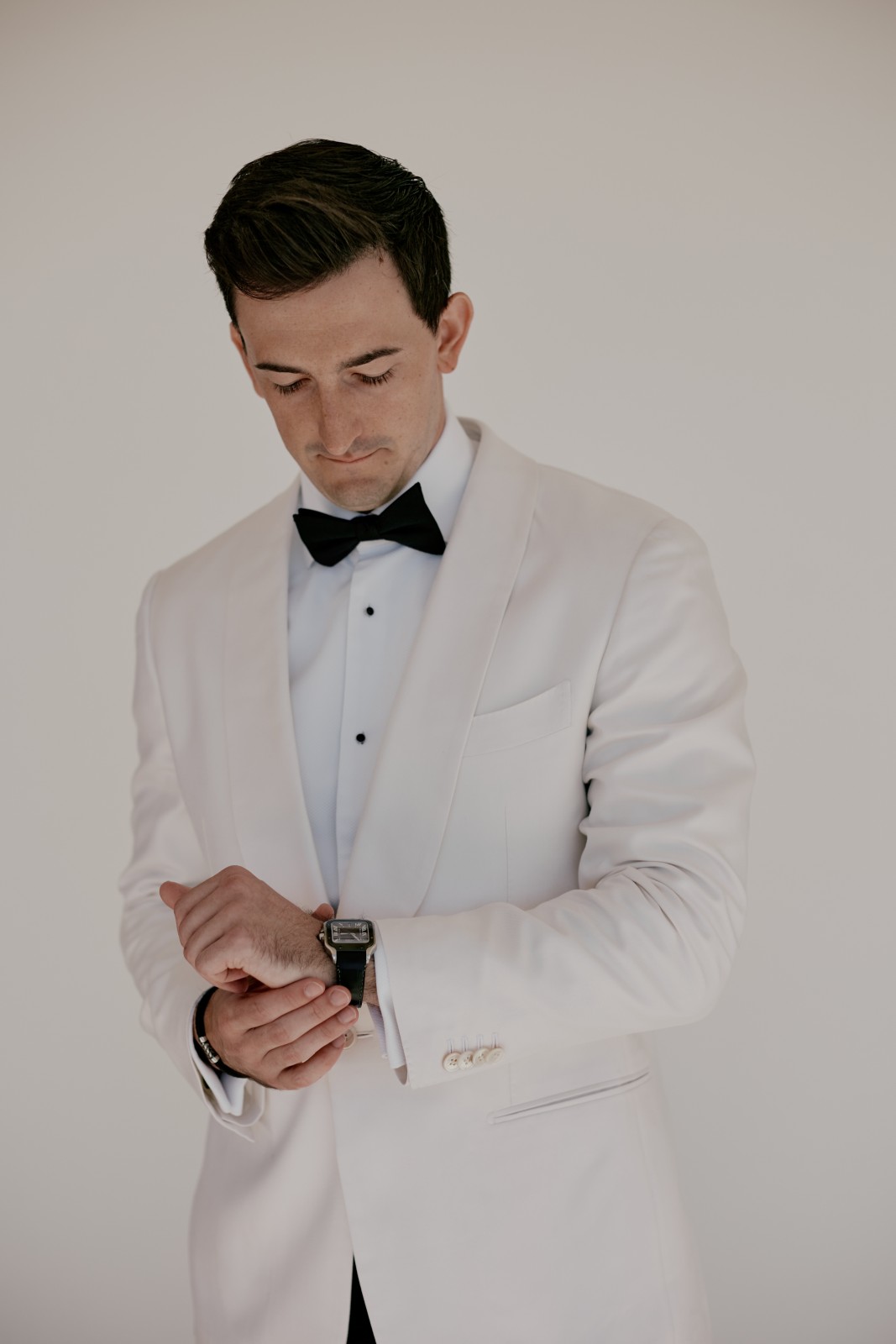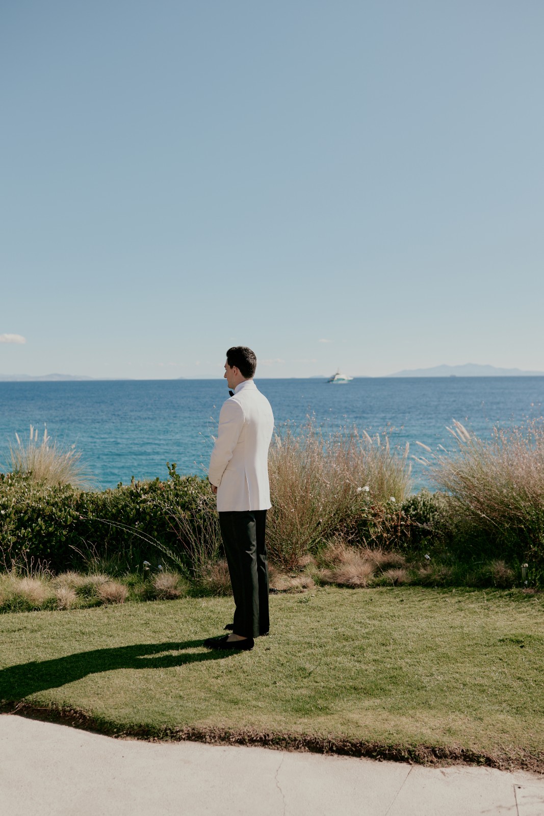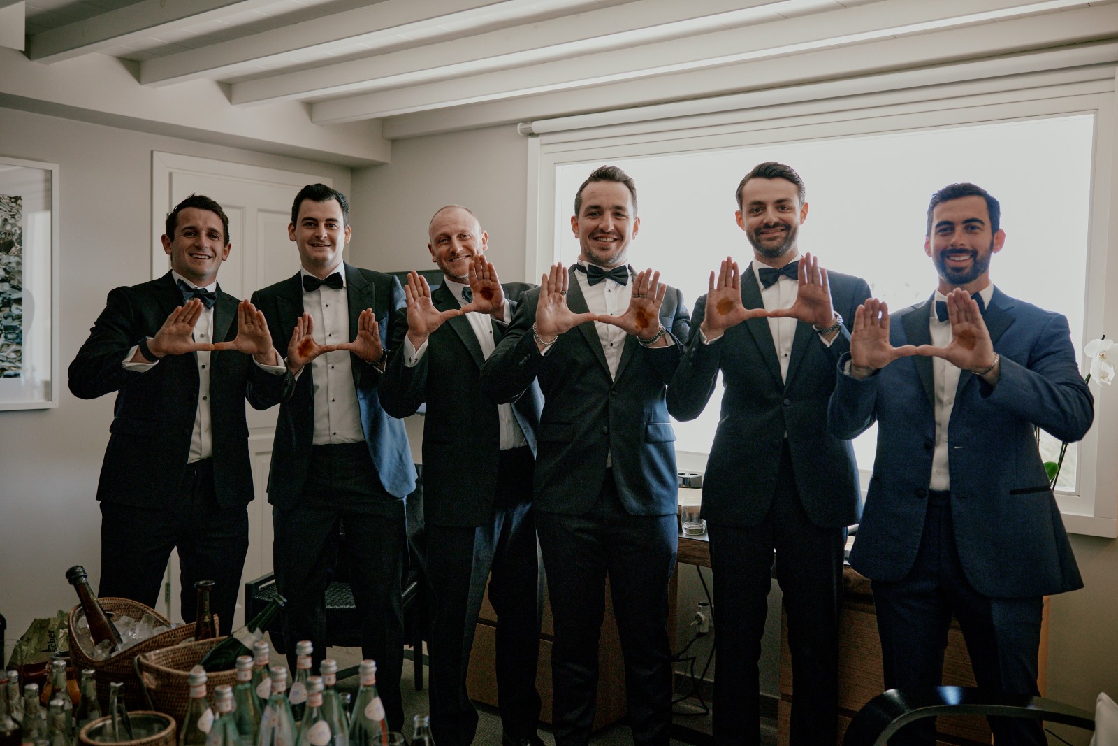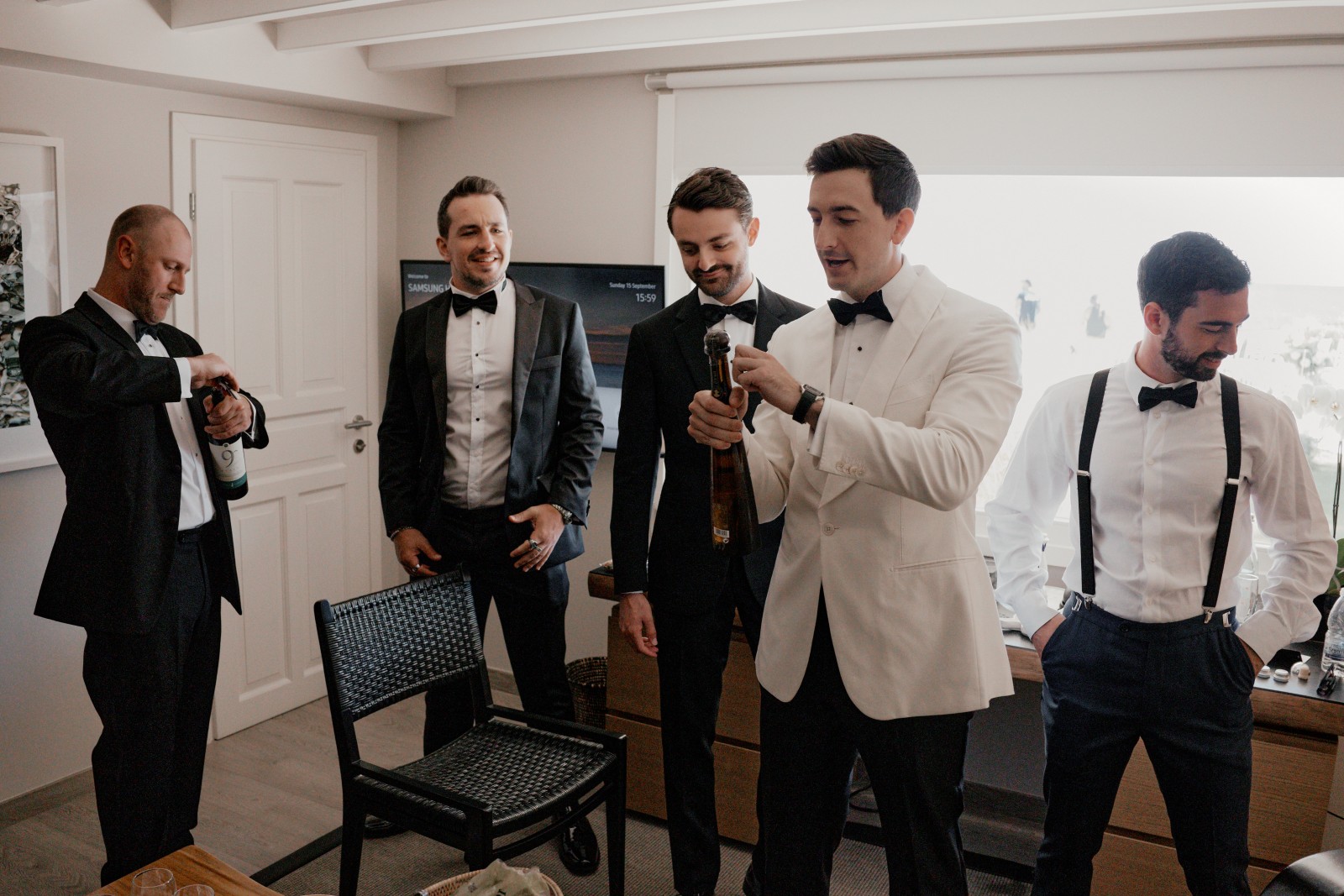 As the morning unfolded, Suzanne slipped into her breathtaking Rita Vinieris wedding dress (did you know that Rita is half-Greek herself?), while her bridesmaids donned soft blue dresses that reflected the serene Aegean Sea. Over in the groom’s suite, Ryan looked dashing in his classic black-and-white tuxedo, surrounded by his groomsmen and loved ones, brimming with excitement for the day ahead.