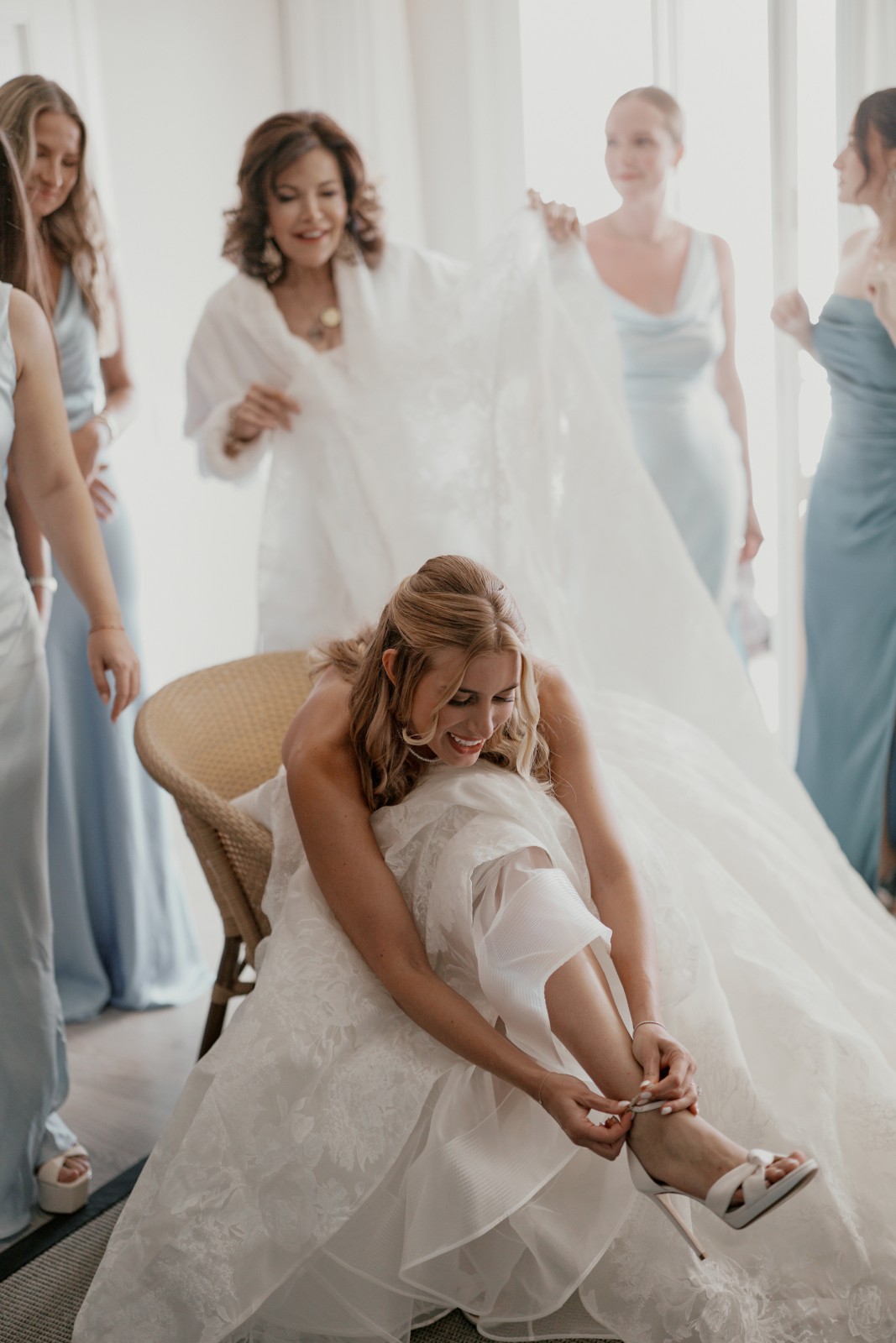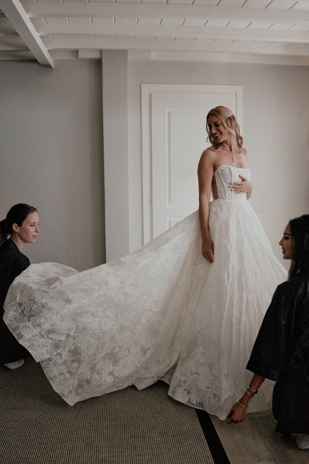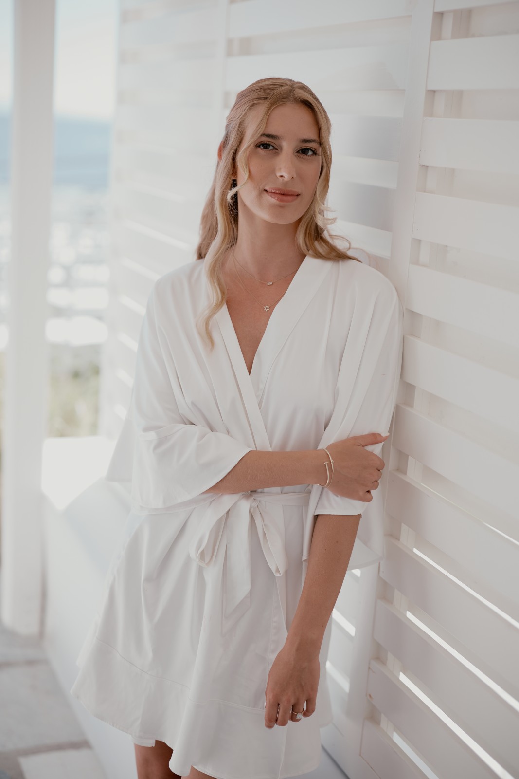 The wedding day began at the stunning Santa Marina Hotel Mykonos, where preparations were underway for a day no one would forget. Suzanne, radiant and beaming with happiness, was surrounded by her closest friends and family as they laughed, reminisced, and prepared for the big moment. Dressed in chic black robes, her bridal party perfectly complemented Suzanne’s white bridal one—a striking black-and-white prelude to the wedding’s timeless white-and-blue Mykonos theme.