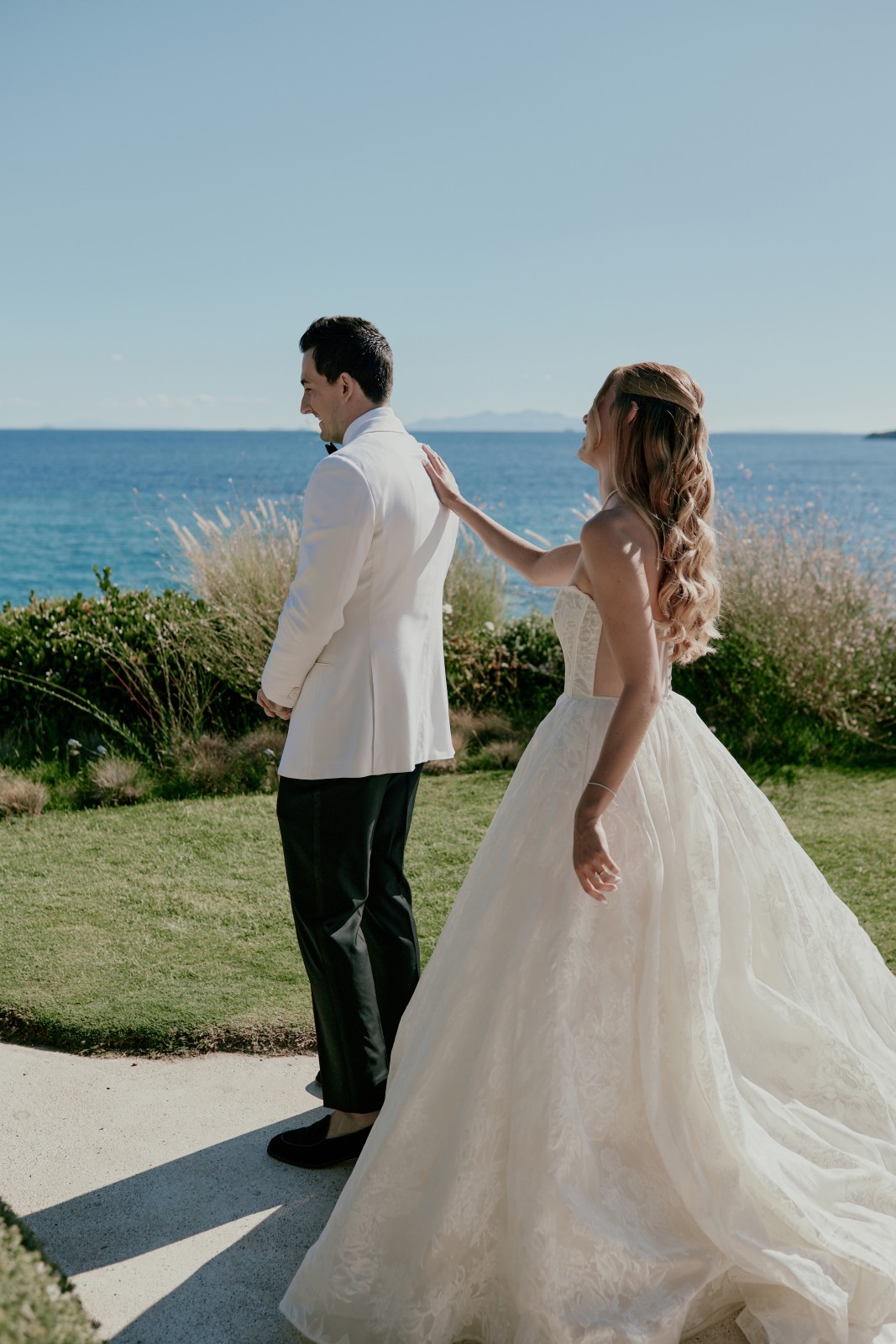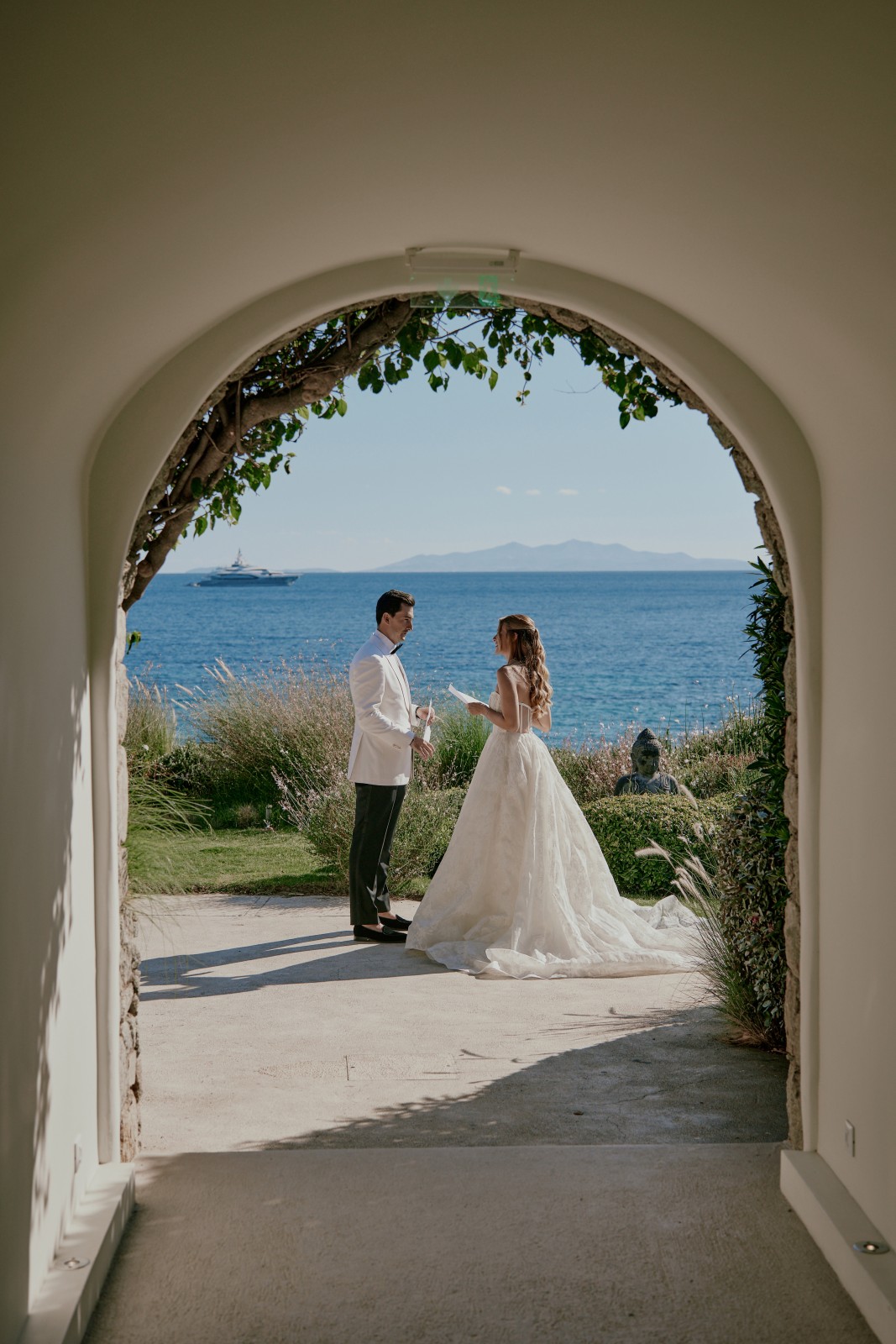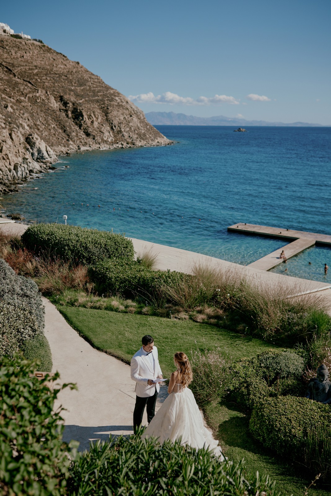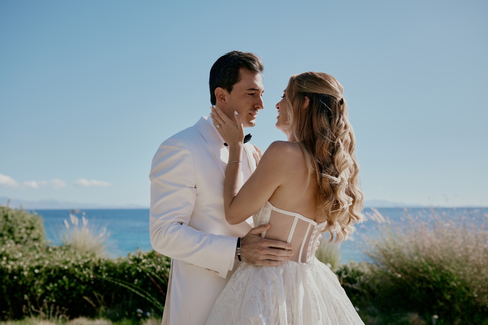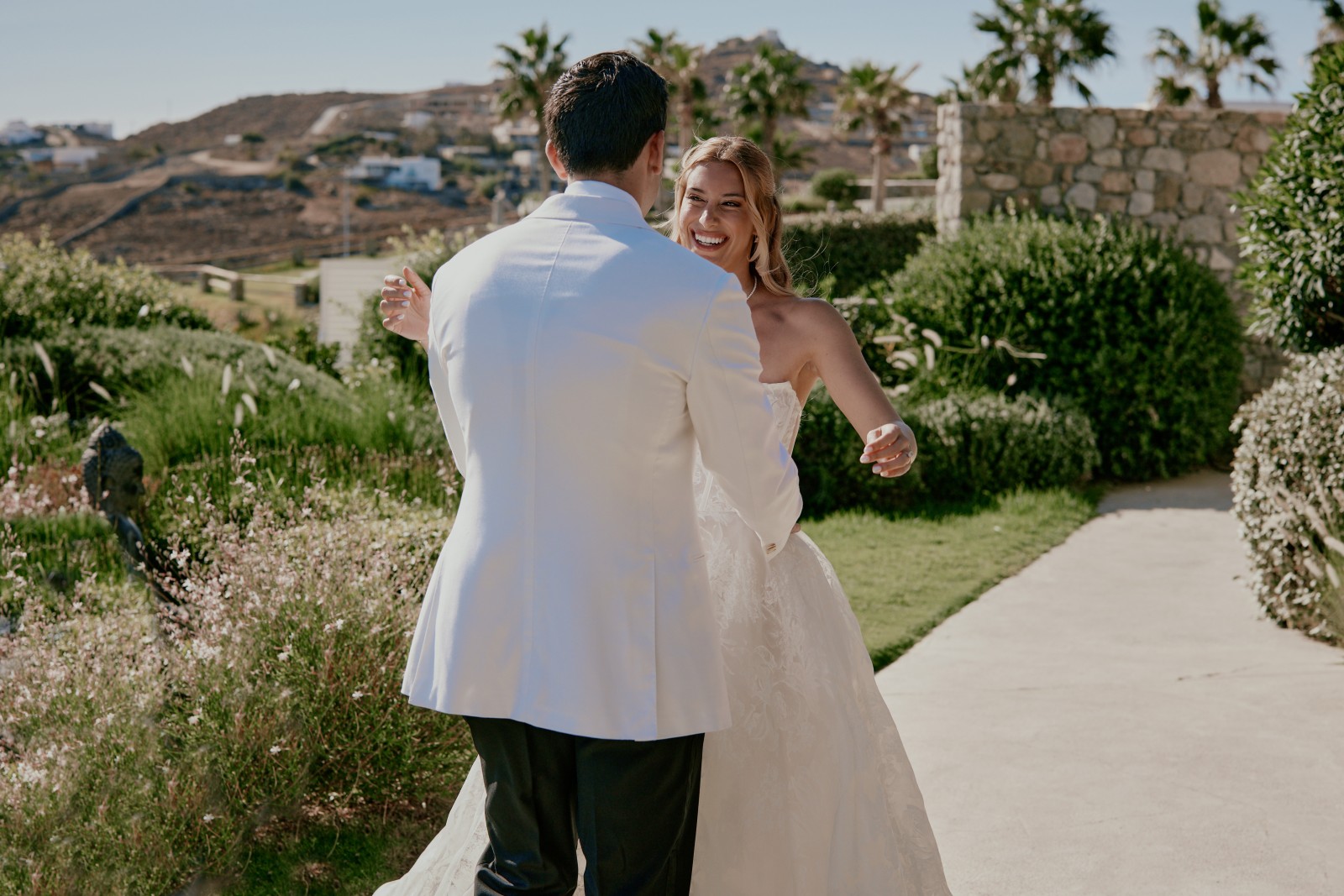 Before the ceremony, Suzanne and Ryan shared an intimate first look in Mykonos. With no one else around, they exchanged personal vows—words that captured the depth of their love, promises for their future, and heartfelt reflections on the journey that had led them to this moment.