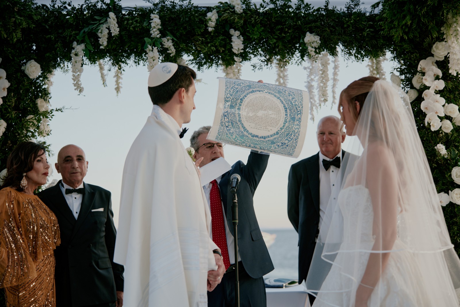 Shortly before the Mykonos wedding ceremony, as Jewish tradition commands, the closest family and friends of the couple privately gathered as witnesses signed the ketubah—the Jewish marriage contract that validates the couple's union.