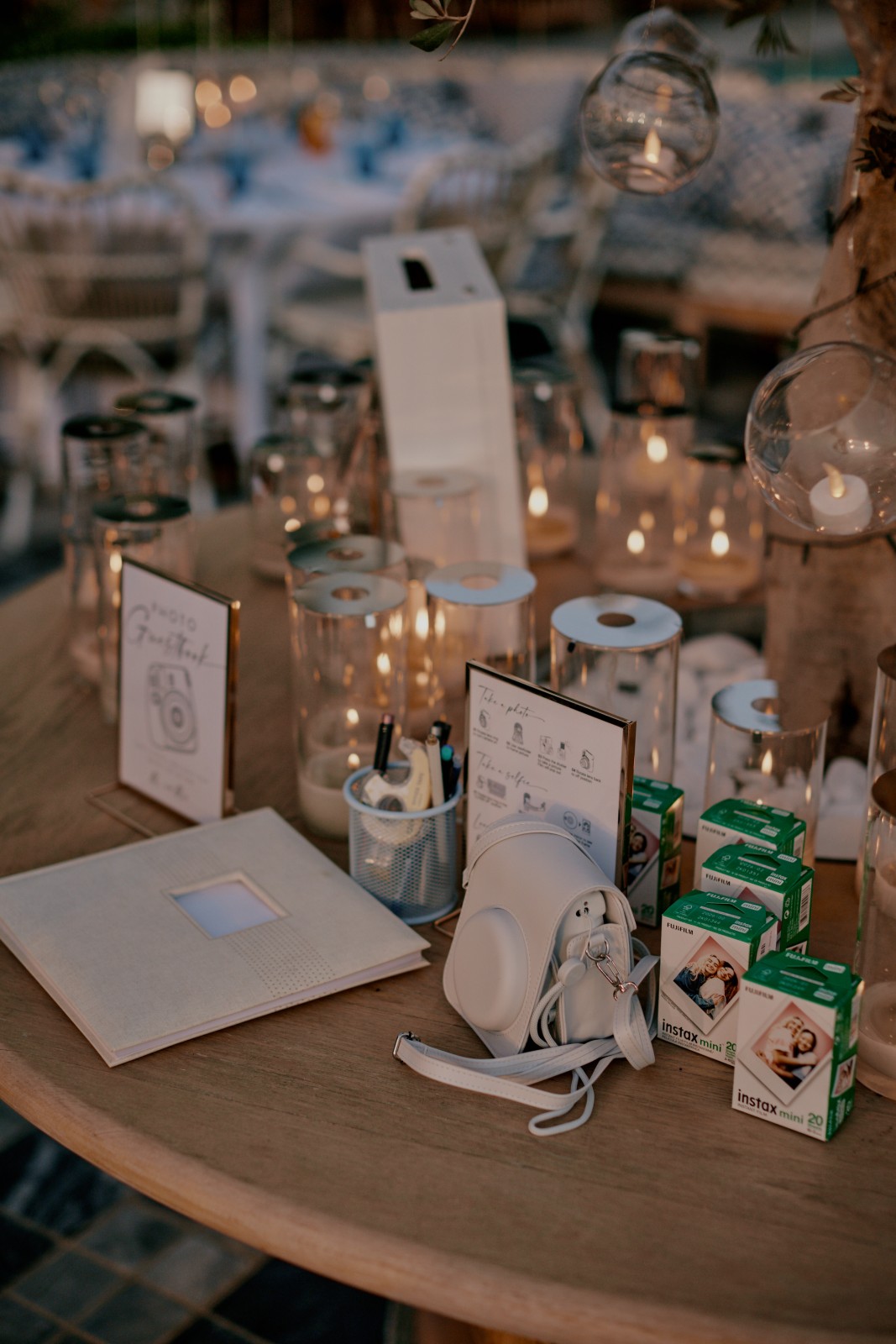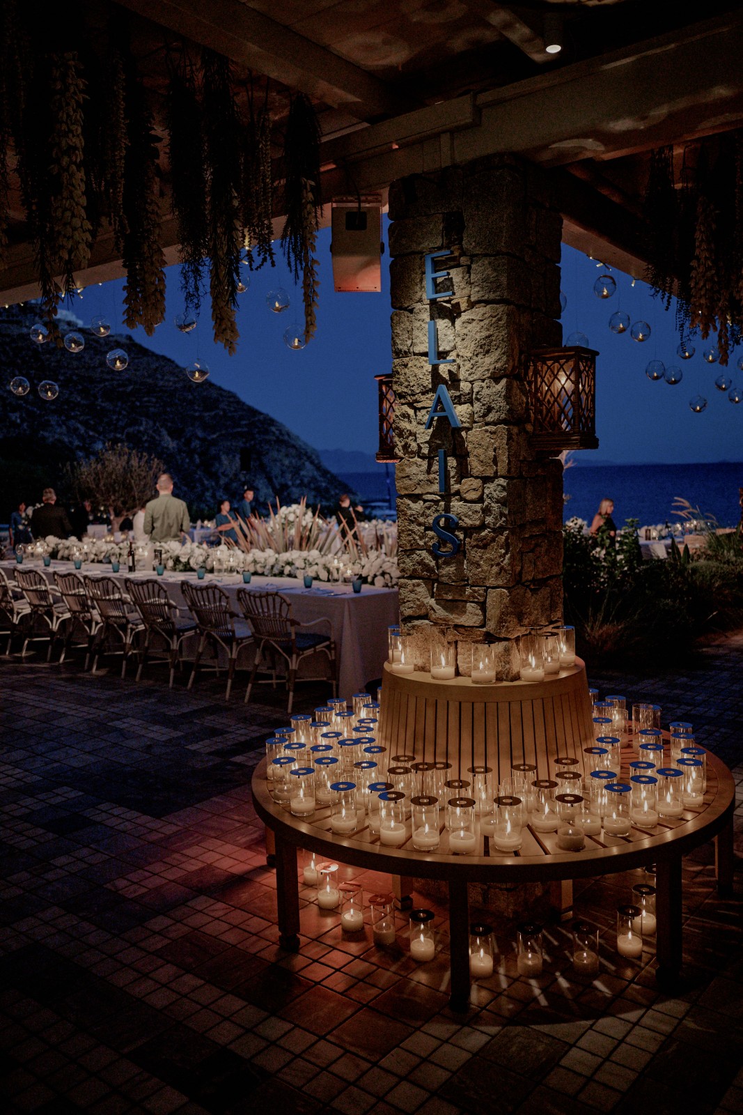 As the sun dipped below the horizon, the celebration moved to an elegant wedding dinner reception. Tables adorned with white and blue accents, thousands of flickering candles, and lush floral arrangements created an atmosphere of timeless sophistication. Guests found their seats on a stunning mirror seating chart before enjoying a delectable kosher wedding meal in Mykonos prepared by Sfez Traiteur.