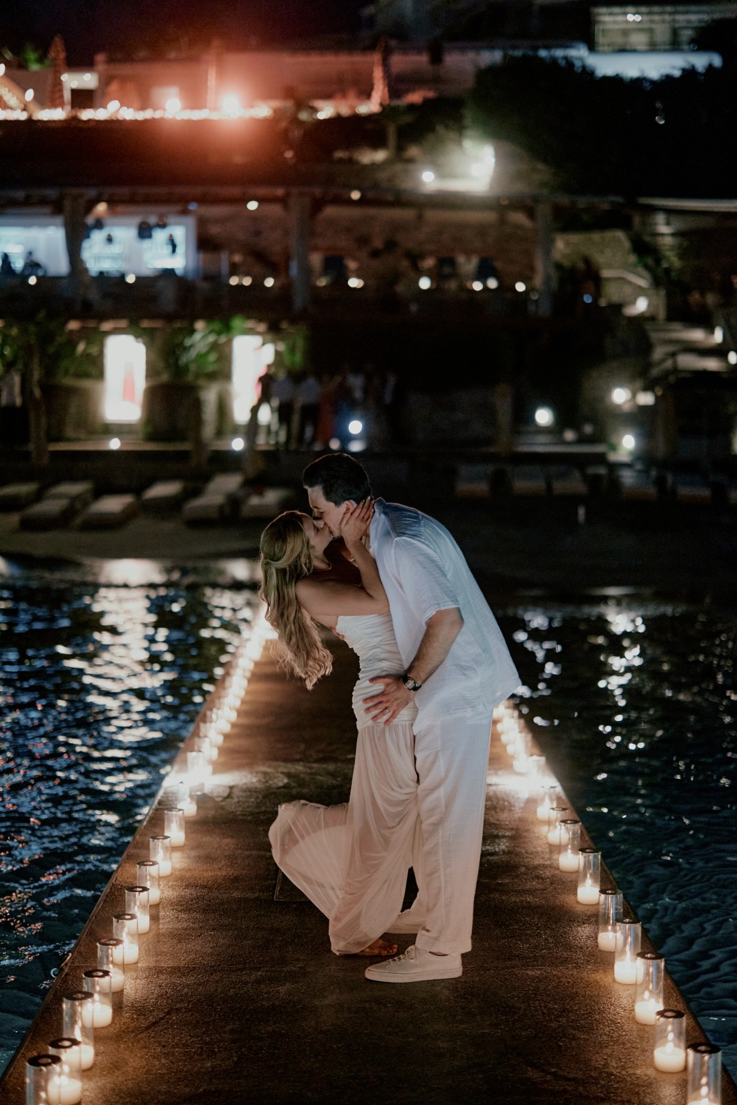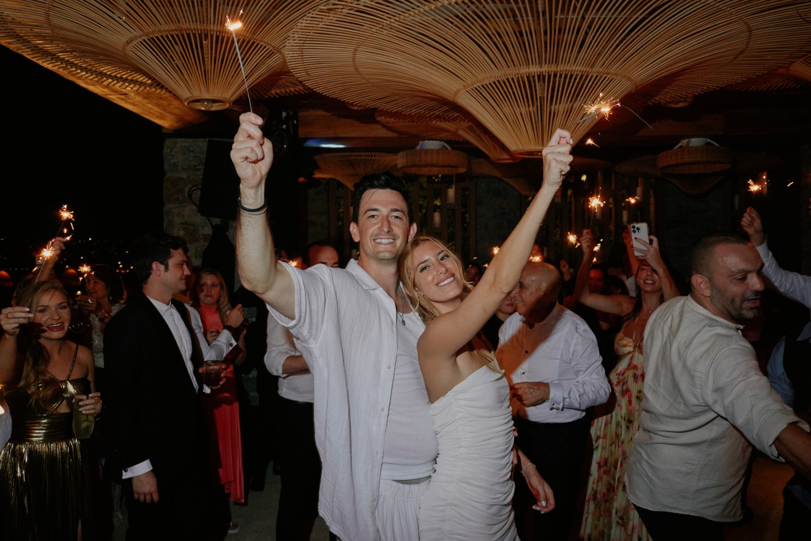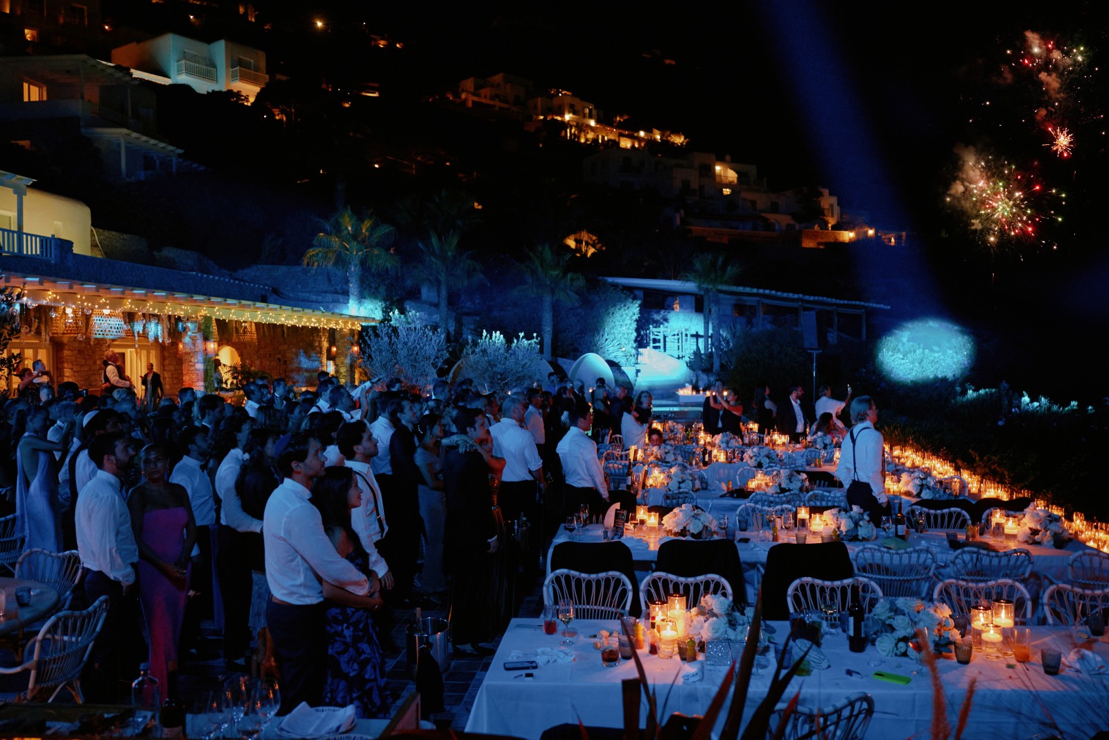 The evening was filled with heartfelt speeches, laughter, and more than a few tears. Suzanne and Ryan shared their first dance, and right after, fireworks lit up the Mykonos sky, setting the tone for an unforgettable Mykonos party.