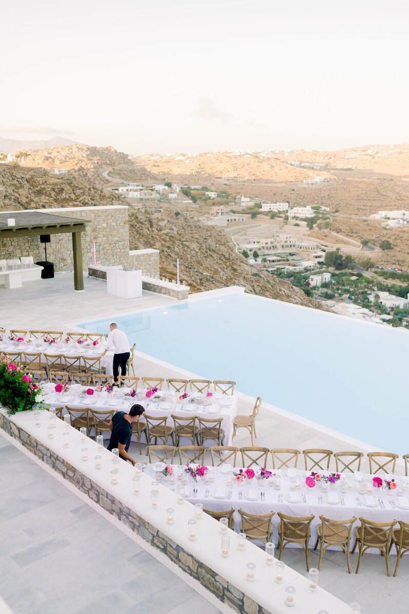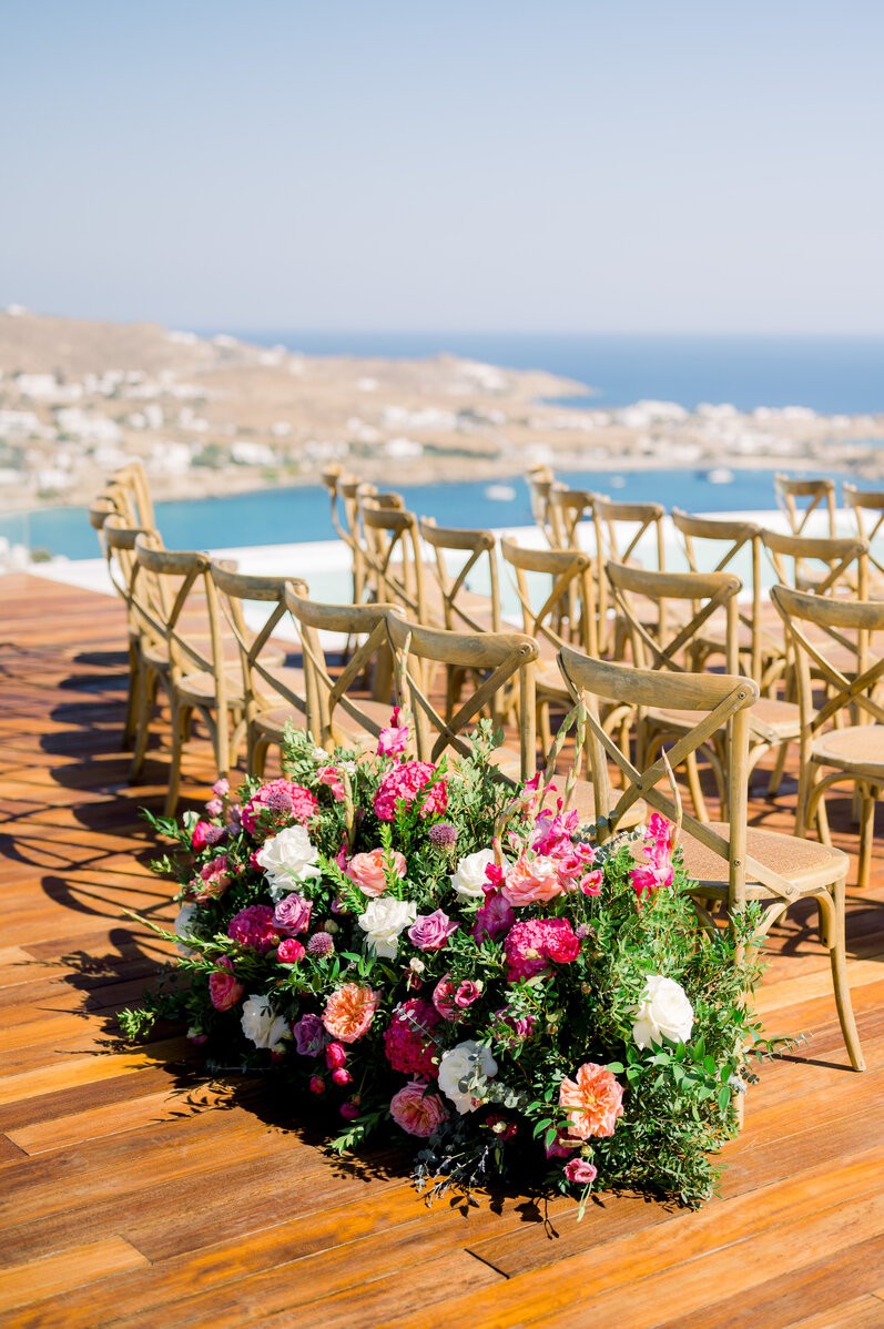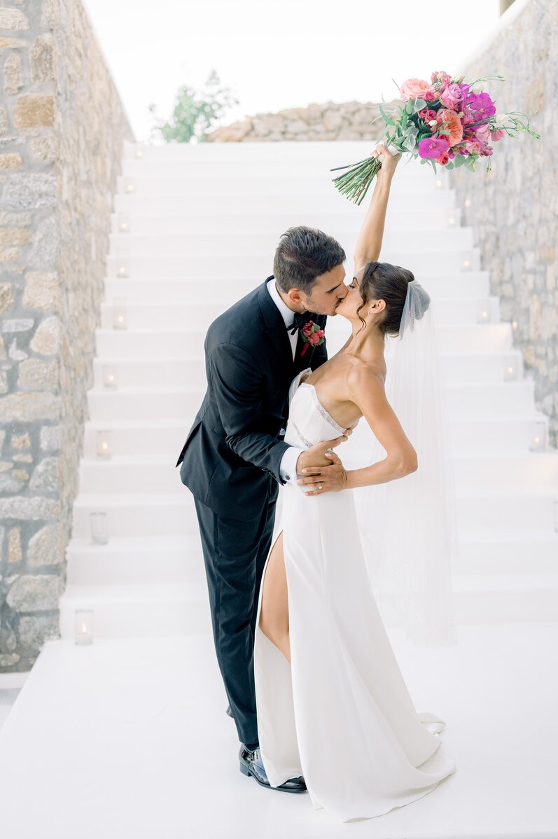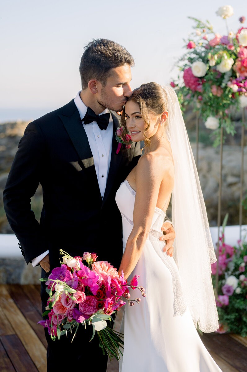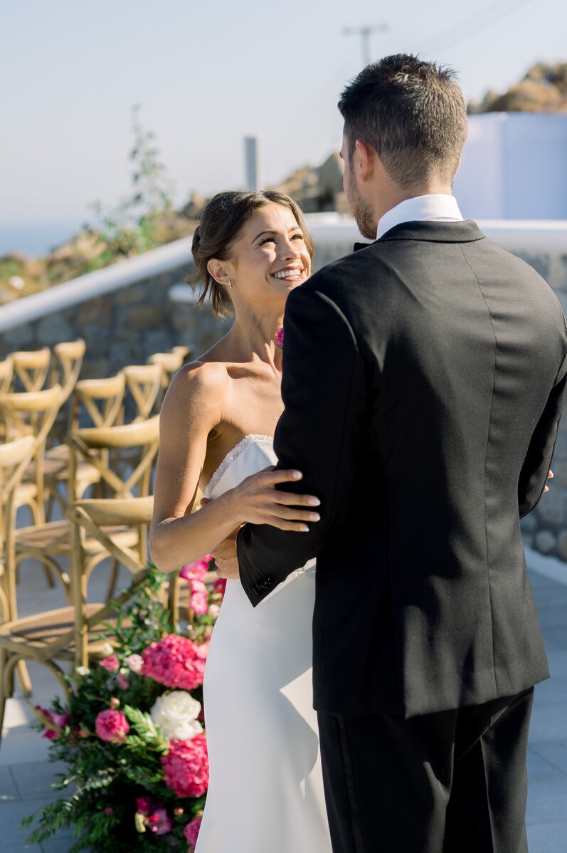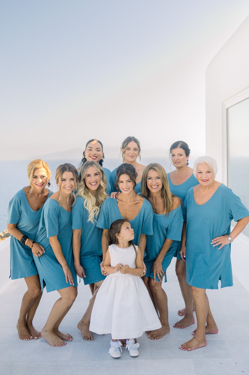 In the enchanting embrace of Mykonos, Shannon and Dennis, our charming couple from New York, embarked on their own dream wedding adventure. Choosing a luxurious Mykonos villa overlooking the mesmerizing Aegean Sea, their celebration unfolded amidst the allure of a Cycladic Greek Island. Inspired by the vibrant hues of bougainvillea trees, they envisioned a Mykonos wedding filled with pops of fuchsia tones, creating an atmosphere truly lively and captivating. With the dress code adding to the famous wedding saying, our stunning bride chose her beloved bridal party to be her “something blue,” completing this visual perfection with a lovely touch.