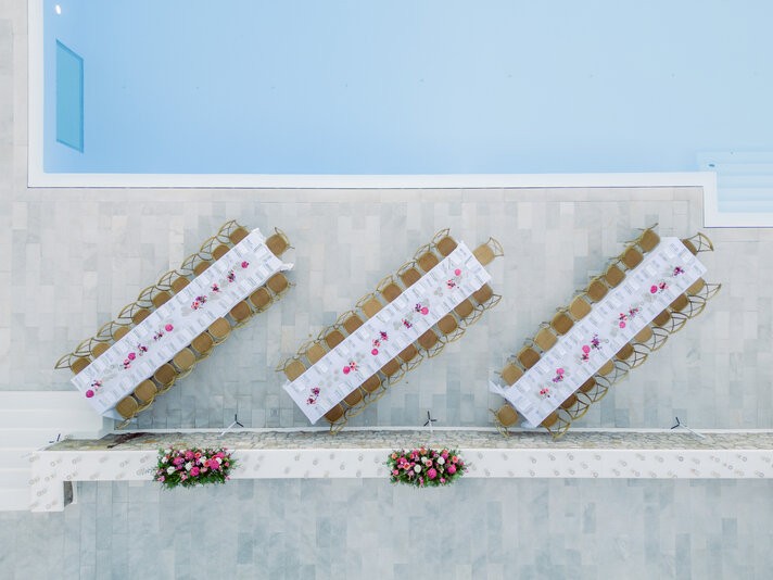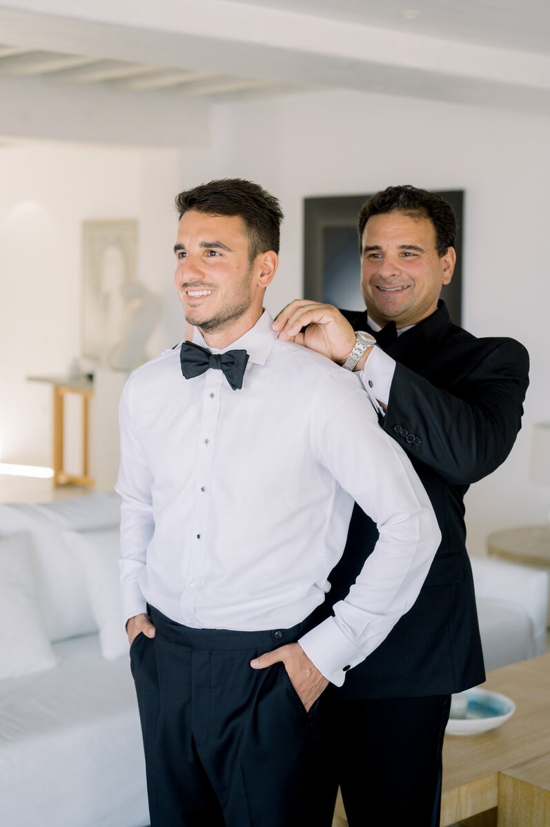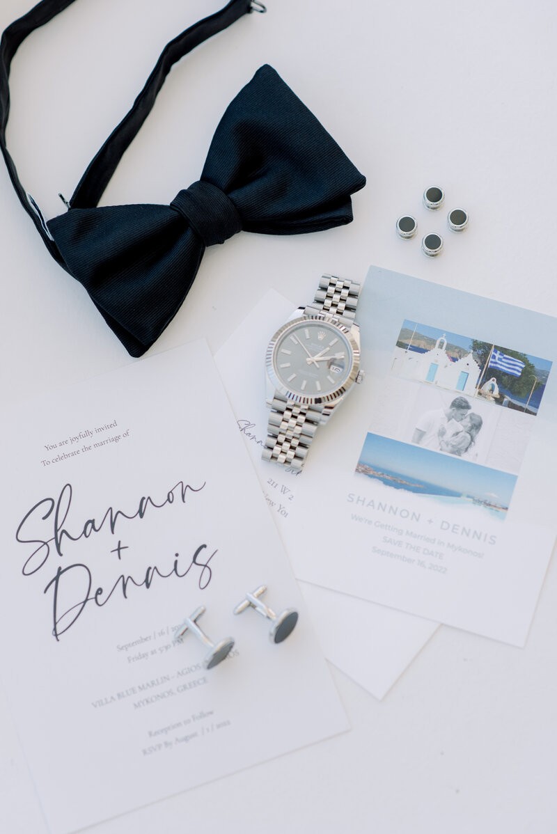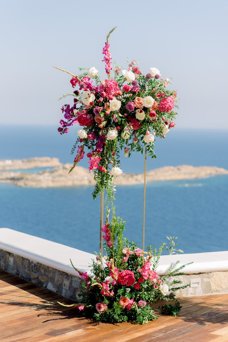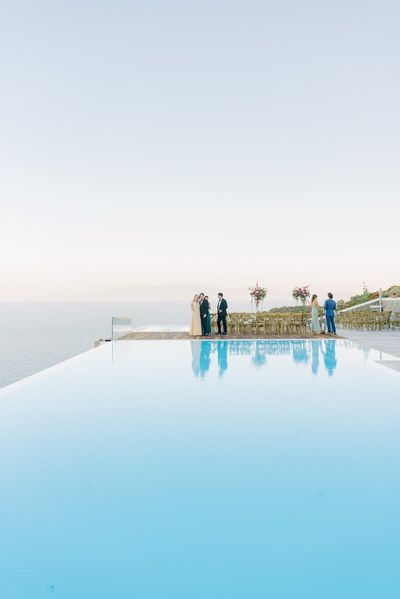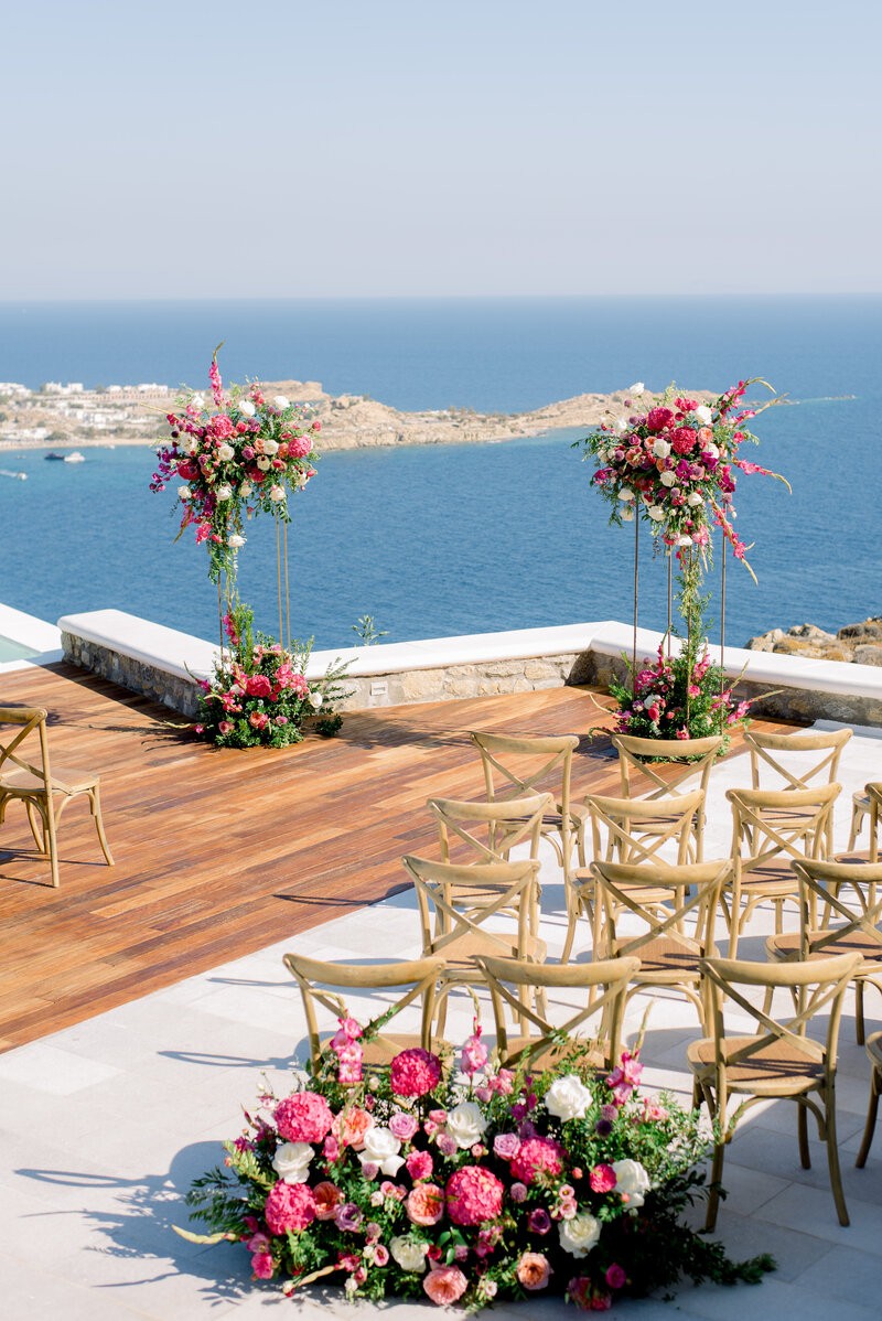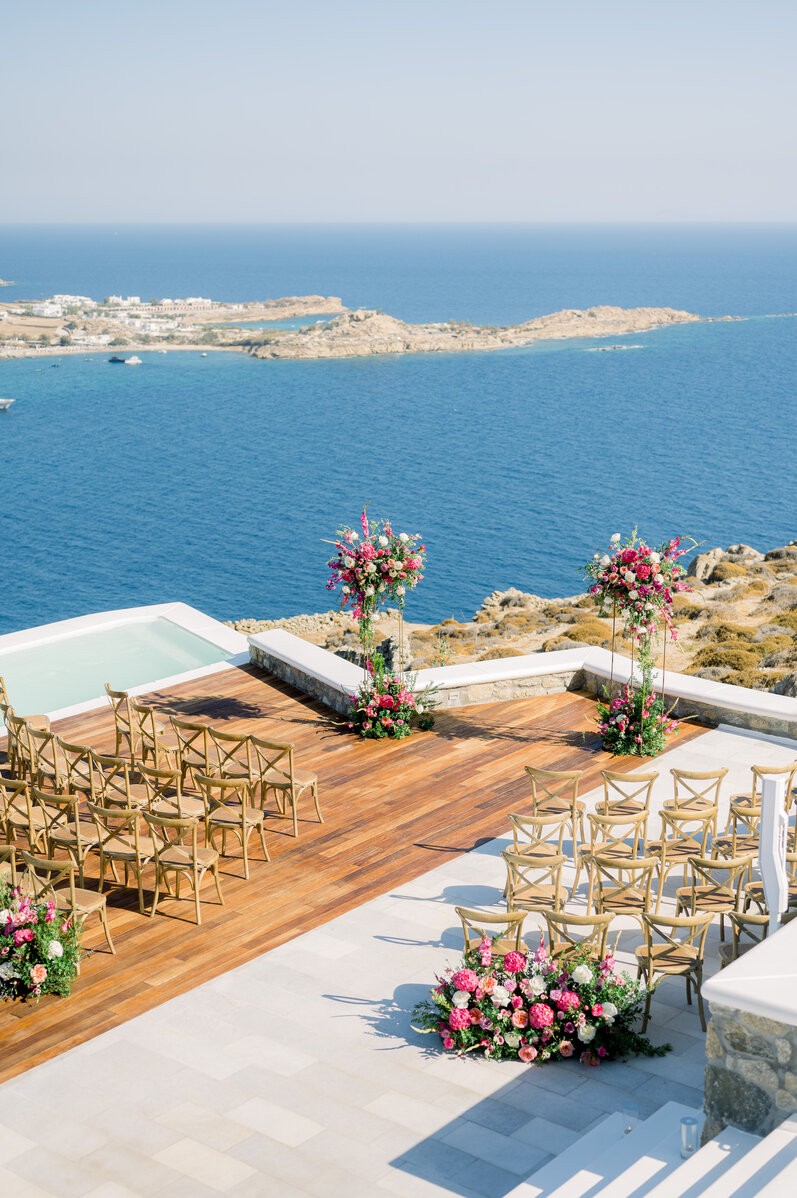 In the enchanting embrace of Mykonos, Shannon and Dennis, our charming couple from New York, embarked on their own dream wedding adventure. Choosing a luxurious Mykonos villa overlooking the mesmerizing Aegean Sea, their celebration unfolded amidst the allure of a Cycladic Greek Island. Inspired by the vibrant hues of bougainvillea trees, they envisioned a Mykonos wedding filled with pops of fuchsia tones, creating an atmosphere truly lively and captivating. With the dress code adding to the famous wedding saying, our stunning bride chose her beloved bridal party to be her “something blue,” completing this visual perfection with a lovely touch.