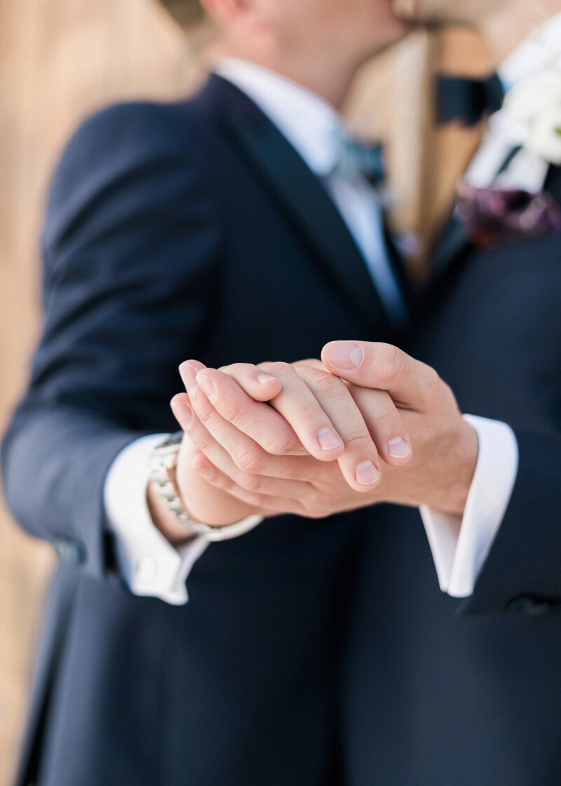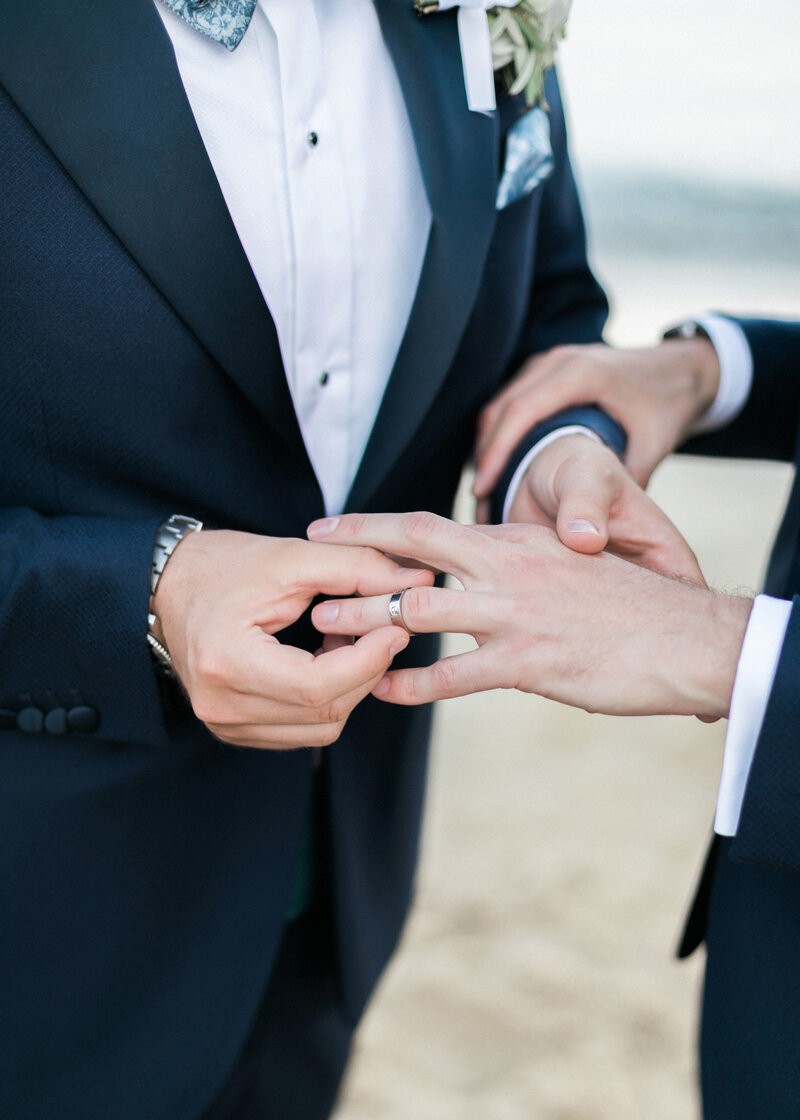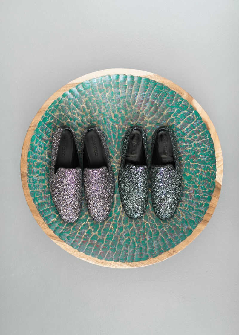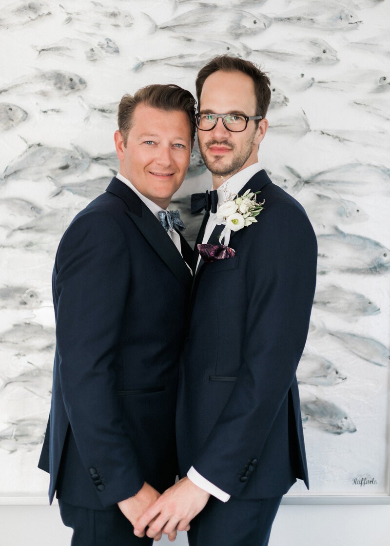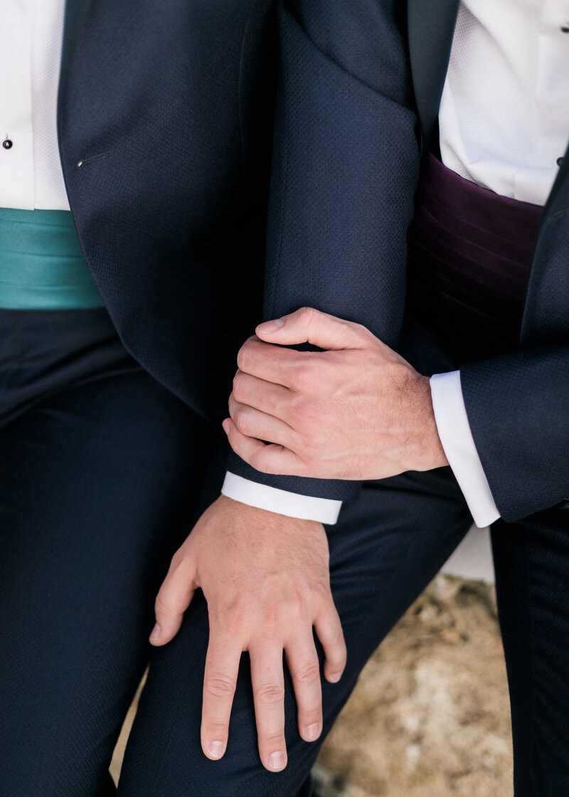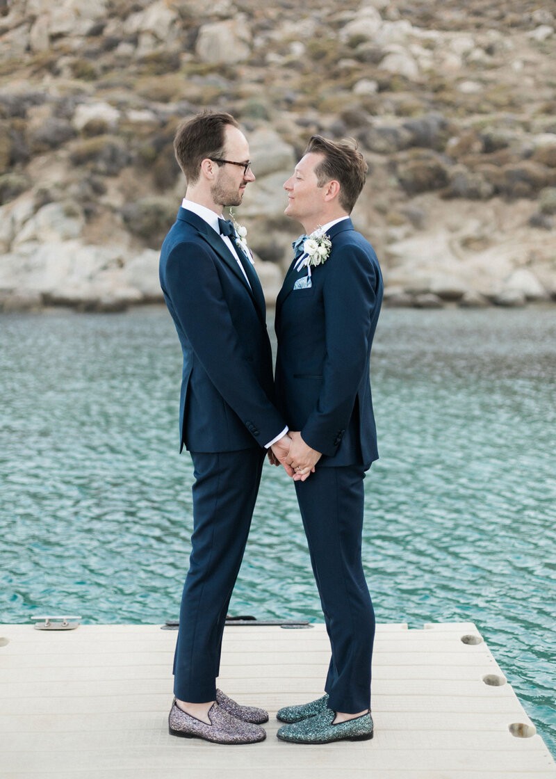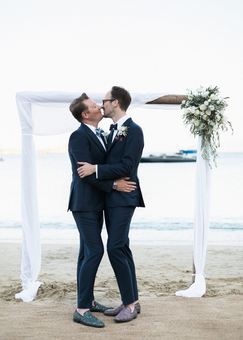 The festivities began with a welcome drink in the heart of Mykonos, at the iconic Little Venice area, where a cocktail bar offered breathtaking sunset views that set the romantic mood just right for the beach wedding that was to follow the next evening.On their special day, Lars and Mathias chose to trust a simple and elegant style that expressed them the most, leaving it to special wedding details to make an impression. And knowing how much we LOVE wedding details, let's talk about the unique Jimmy Choo sparkling shoes they donned, in blue and in purple respectively, adding a touch of flair to their attire. The "A hotel" was the perfect backdrop for their preparations, setting the stage for a grand wedding entrance aboard the Riva Nammos boat, which ferried them to the beachside ceremony.